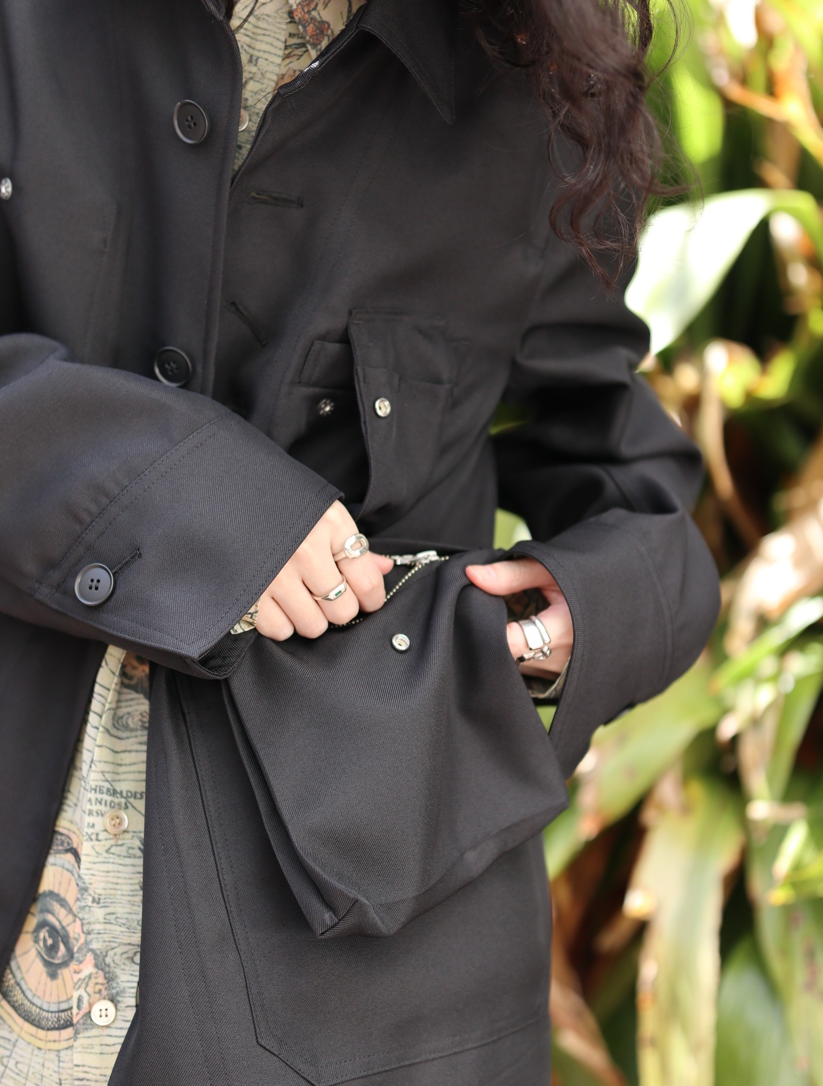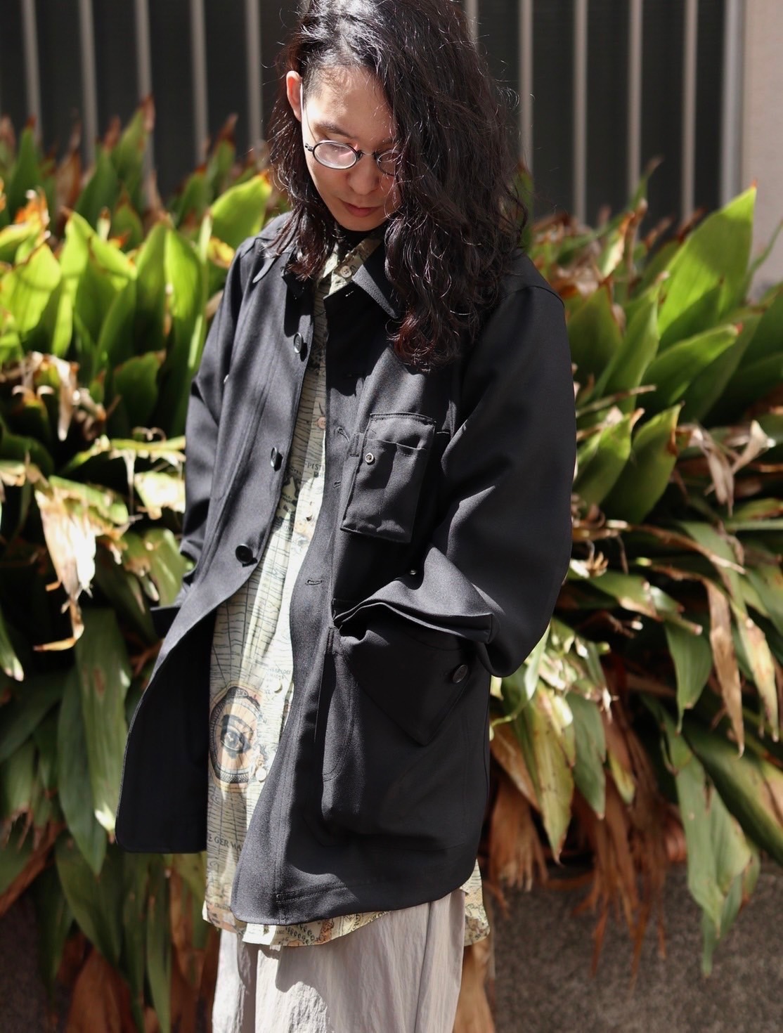 その空気感を今期最も象徴するのがこのカバーオール。いや、カバーオールと呼ぶよりも、ジャケットに近いのかもしれません。カジュアルなカバーオールの機能美を残しつつ、シャープでエレガント、そして色気のあるフォルムにモダナイズされています。見た目と着たときの不思議なギャップがあり、展示会で見た時から最も気になっていたアイテム。